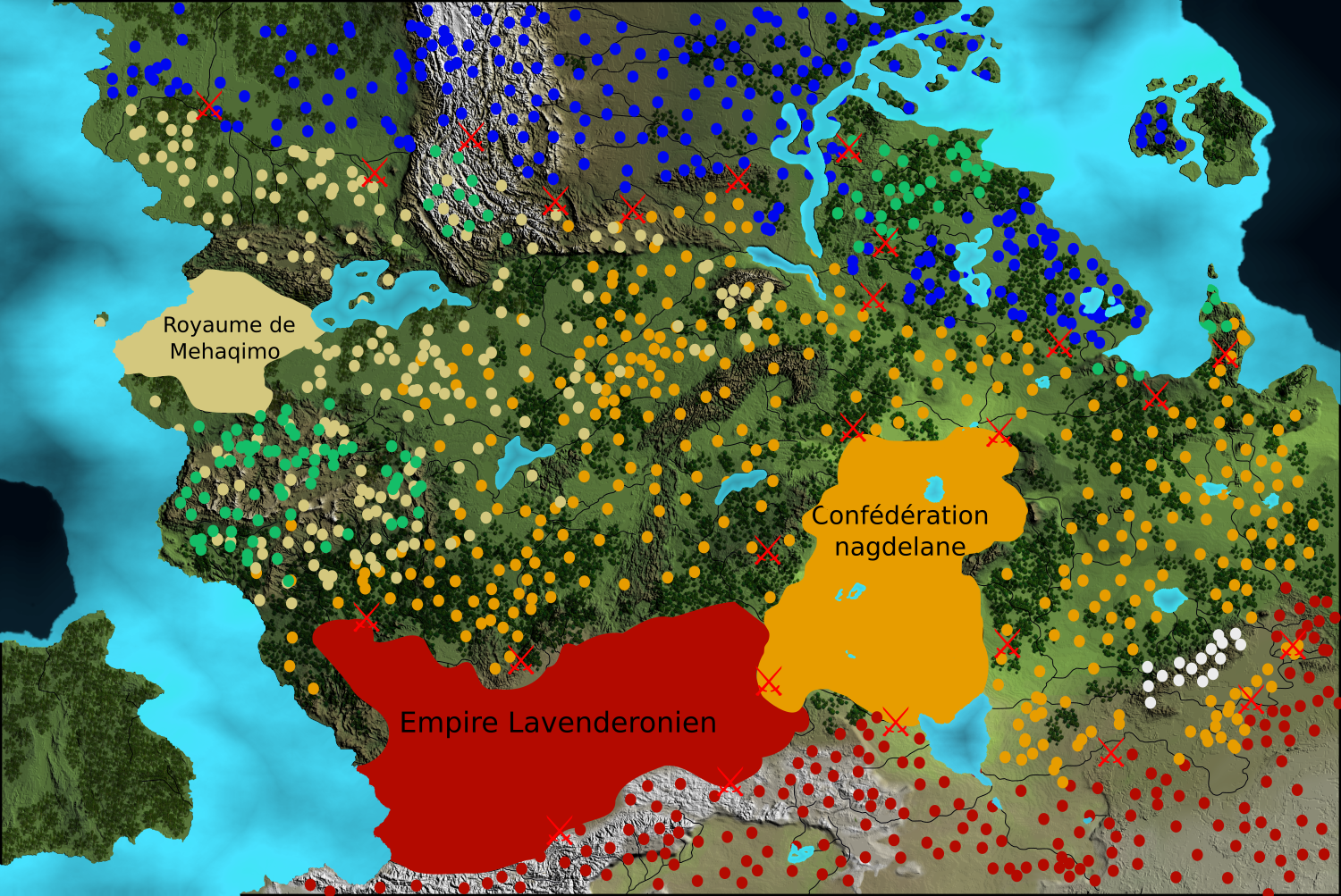 • Au Nord, les euréens remportent des succès dans les Monts sans sommets où ils repoussent les sloqashis, exténués par des siècles de combats et fuite. Sans le soutien des noqimiens, ils auraient sans doute déjà disparu de ces montagnes. Les euréens parviennent également à conquérir les îles de la Mer du levant et colonisent les Iles nikiennes. Ils ne peuvent cependant pas progresser au Sud, où les noqimiens (à l'Ouest) et les rëgasiens (à l'Est) les tiennent fermement en respect. Ils perdent même du terrain en Rimta, ainsi que le contrôle du bras de terre reliant la Bäadarlamern à Rimta. Ce dernier événement, conjugué à la persistance jusqu'à nos jours des sloqashis à l'ouest de Bäadarlamern, aura un impact considérable sur le développement d'une ethnie euréenne bien distincte et coupée du monde. De même, séparés des noqimiens par les rëgasiens, les sloqashis de Bäadarlamern ne pourront bénéficier de leurs apports technologiques et culturels, et resteront plus primitifs. Ils s’appelleront eux-mêmes ardelakis. Les rëgasiens et noqimiens continuent de cohabiter plutôt pacifiquement. A nouveau, on peut évoquer les conflits ethniques de grande envergure mettant en avant des ennemis communs : les euréens (au Nord) et les slaeciens (au Sud). De plus, les noqimiens ont déjà cohabité avec les rëgasiens sur Kanassa, et ont migré depuis la même région d'Alma. Leur culture est donc assez proche. De nombreux petits conflits amènent bien quelques tensions entre les deux peuples mais aucune guerre inter-raciale n'existe et de nombreux petits royaumes combinant les deux cultures sont fondés. Le royaume de Mehaqimo rassemble les plus anciennes familles noqimiennes en Zuqima. Ils sont assez nostalgiques d'Alma, et nourrissent l'espoir de rétablir le contact avec leur continent d'origine. Les tempêtes de l'océan ouest les empêchent cependant de vraiment développer une marine. On raconte qu'ils sont néanmoins parvenus à envoyer des navires sur Alma, mais comme ils n'en sont jamais revenus il est difficile de le prouver. Au Sud, les slaeciens fondent l'Empire Lavenderonien. Cet état guerrier, fondé par Lavenderon l'intraitable, persistera durant des siècles. Sa cavalerie redoutable constituera une menace permanente pour les alma-pandréens du sud. Si les forêts d'Awanuqima et Zalmarima suffisent en elles-mêmes pour décourager les attaques des lavenderoniens, les habitants du bassin nagdelan n'ont pas cette chance. Face à la menace des armées slaeciennes, ils forment la puissante confédération nagdelane. Celle-ci tient tête aux slaeciens au Sud, et ambitionne de confédérer les autres rëgasiens, notamment par la force. Elle finit par être en guerre avec tous ses voisins. A l'Est, les slaeciens sont encore et toujours bloqués par les grands fleuves de Vunkan, farouchement défendus par de valeureux royaumes rëgasiens dont l'histoire n'a pas retenu le nom. Les slaeciens finissent toutefois par prendre pied dans les Monts Hitlar. Leurs problèmes démographiques, aggravés par leurs raids constants et la rudesse de leur territoire, ne leur permettent cependant toujours pas de constituer de véritables royaumes. Les issis sont parvenus à se faire oublier, mais leur civilisation parvient à se développer de façon inattedue sous terre. Leur réseau de galeries est en passe de relier les Monts Noldenis aux Monts Hitlar.